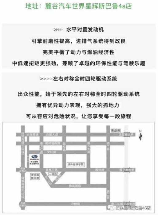 地址:麓谷汽车世界星辉斯巴鲁4s店