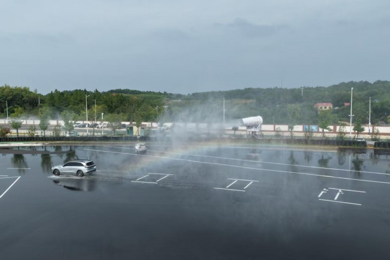 区别于传统测试的“单点考核”,本次赛事国家级试验场,特别设计 “智驾压力测试”全场景链:全国首条近3公里组合辅助驾驶赛道,融合环岛通行、儿童 “鬼探头”、弯道侧翻车辆避让等 12 项日常高频风险场景,挑战车辆在动态行驶中连续应对突发状况的能力,全面检验智驾系统感知、决策、执行的协同性;而全国首创的“动态淋雨广场” 更将难度升至巅峰 —— 人工造雨系统模拟暴雨环境,横风系统可实时调节风力,参赛车需在低能见度雨中完成 R250 弯道避险、静止打伞假人精准识别等任务,传感器抗干扰与系统应急响应能力成为决胜关键。